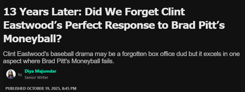 It took receiving a Google Alert on my name to see that my 2012 review of Clint Eastwood’s simple and mild baseball film Trouble With the Curve was recently quoted and cited on the media site FandomWire. Senior Writer Diya Majumdar wrote a piece about Trouble With the Curve standing as clapback answer to Bennett Miller’s 2011 revered Moneyball and the style of statistically-centered baseball scouting it champions. They didn’t ask for my permission, but I don’t mind. Thanks for the reference and clicks!